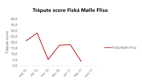 Det er ingen hemmelighet at bløtt strø har vært og fortsatt vil være en utfordring i en narasinfri produksjon. Tråputescoren er et konkret mål på dyrevelferd og en indikasjon på dårlig strøkvalitet. Det har vært et fokus for Fiskå Mølle å forbedre seg på dette området, og vi har kommet frem til et fôr som har hatt positiv innvirkning på denne faktoren. Siden september har vi ligget lavere enn tidligere måneder og generelt lavere enn snittet.