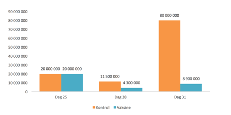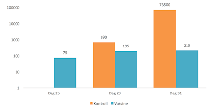 Vaksinen ble sprayet direkte på startfôret til kontroll leddet rett før kyllingen ble satt ut i huset. Dette for å sikre at kyllingen skulle få i seg en levende vaksine. Strø prøver ble samlet inn på dag 25, 28 og 31 og sendt inn til analyse for å følge med på utviklingen i den kritiske perioden. Man fant igjen lave nivåer av Eimeria spp. på test leddet, men på nivåer som ikke anses høye nok til å kunne forårsake et utbrudd av koksidiose. I kontroll leddet hvor man ikke hadde gitt vaksine fant man på dag 25 ikke parasitt men utover innsette på dag 28 og 31 observerte man mange flere parasitter.